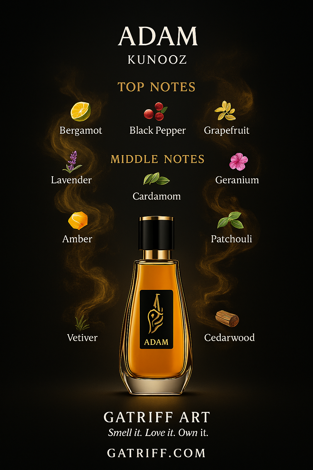 Adam by Kunooz is a bold and charismatic fragrance designed for the modern man who wants to leave a lasting impression. It opens with sparkling top notes of Amalfi lemon and lavender, delivering a fresh, clean, and energetic introduction. At its heart, earthy and aromatic tones of cypriol oil, nagarmotha, and sea notes add depth, complexity, and a rugged sophistication. The fragrance settles into a warm base of amber and patchouli, combining richness and sensuality for a trail that lingers long after application.
